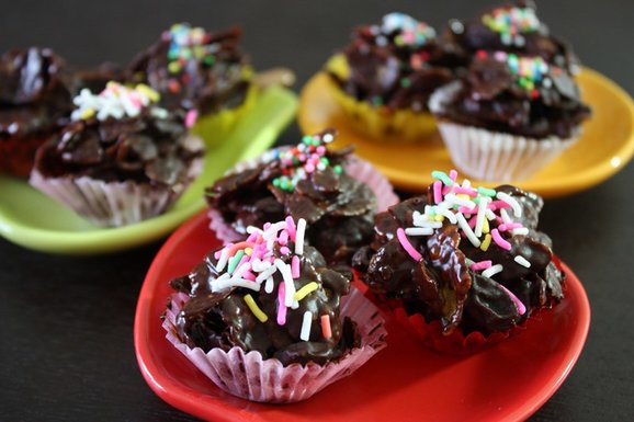 -> THE LIQUID MUST BE RUNNY AND SMOOTH. ADD CORN FLAKES TO THE MELTED DARK CHOCOLATE.